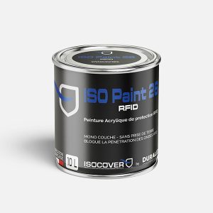 ISO Paint 26 est une peinture de protection à base aqueuse, spécialement conçue pour bloquer les ondes RFID et réduire l’exposition électromagnétique dans les espaces sensibles. Son application se fait en une seule couche, sans prise de terre, avec un séchage rapide et une finition noire mate élégante.